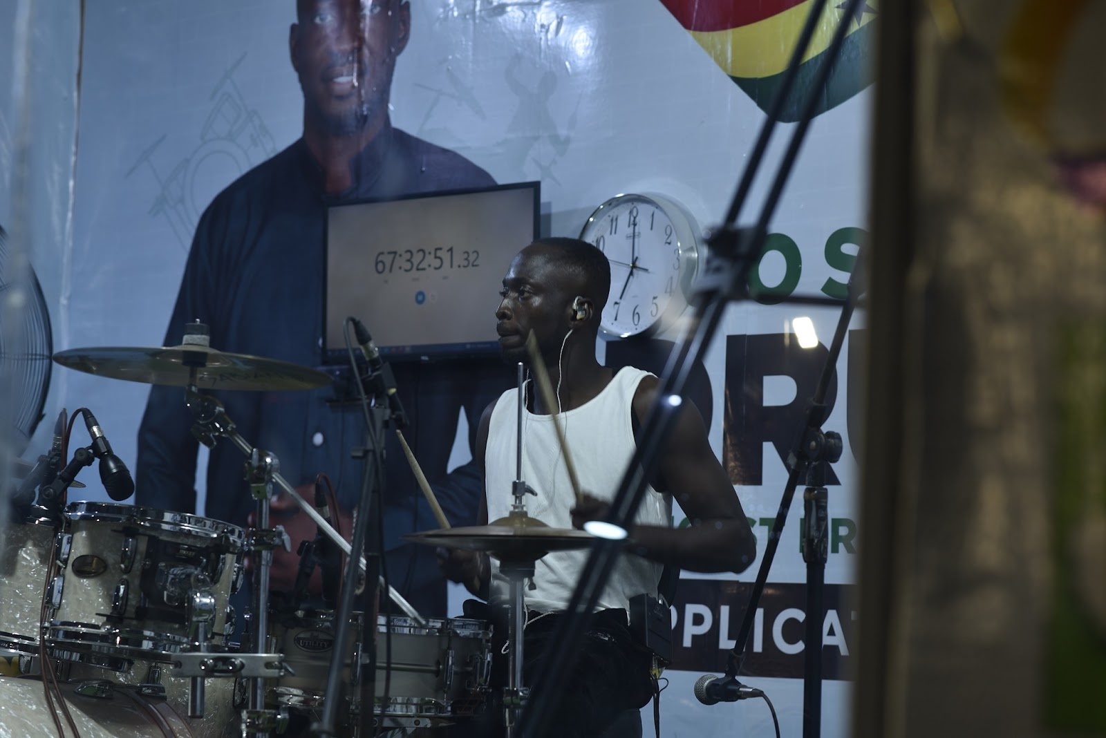 I spent some time on Sunday, April 28, 2024, at Joseph Adu-Peprah’s ongoing drum-a-ton attempt in Accra to beat Allister Brown’s (UK) current world record of 150 hours and 1 minute set in Lisburn in 2023.