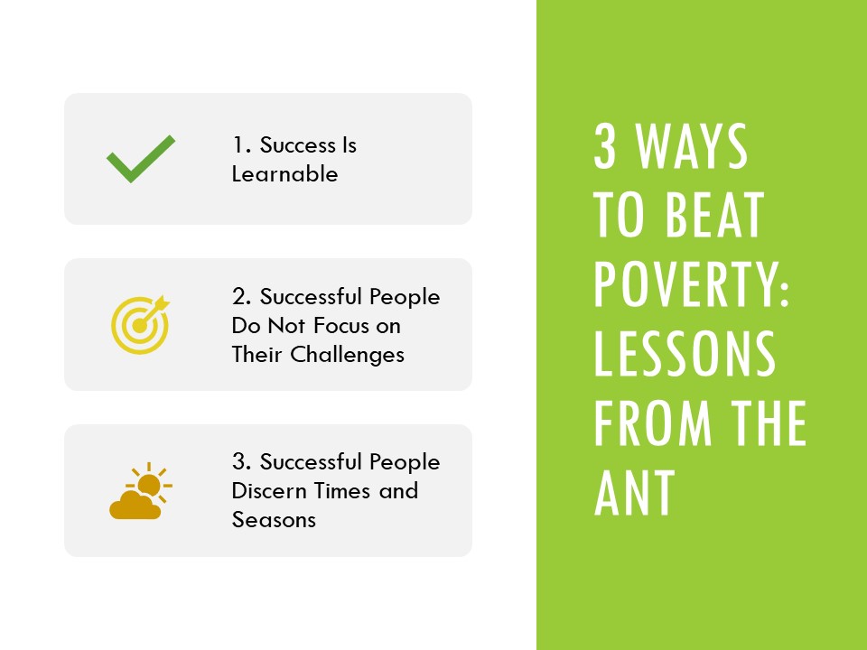 The first thing the writer teaches us is that success is learnable, just as failure is. It instructs the sluggard to learn from the wise ants and become wise.