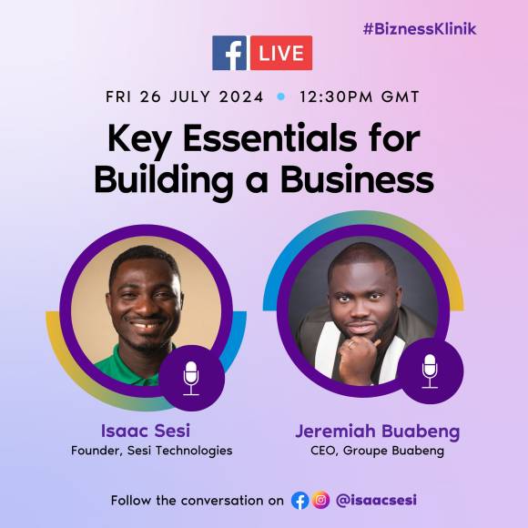 BiznessKlinik invites you to join an insightful webinar this Friday, 26th July at 12:30 PM GMT, featuring hosts Isaac Sesi of Sesi Technologies and a special guest, Jeremiah Buabeng of Buabeng Group. They will delve into the key essentials beyond capital that every entrepreneur needs to know.