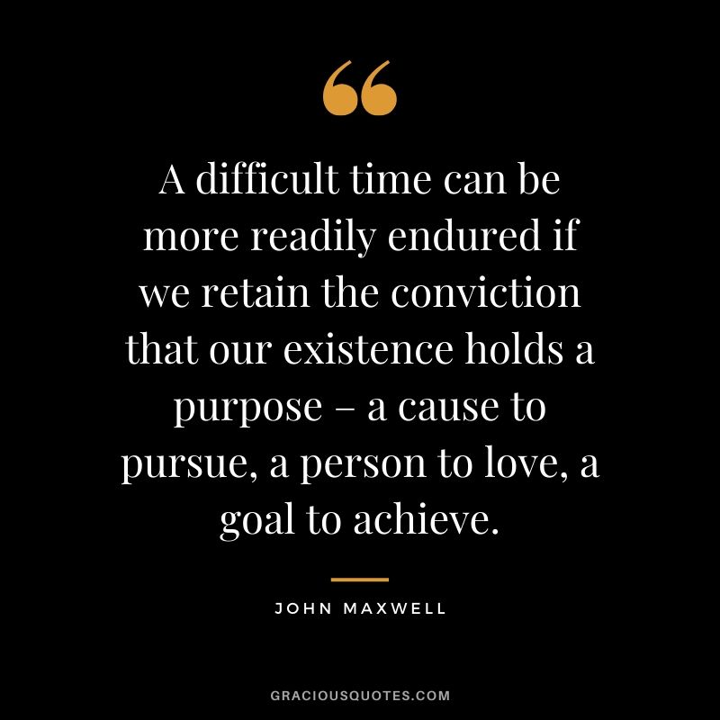 “A difficult time can be more readily endured if we retain the conviction that our existence holds a purpose – a cause to pursue, a person to love, a goal to achieve.” — Dr. John C. Maxwell, American leadership expert.